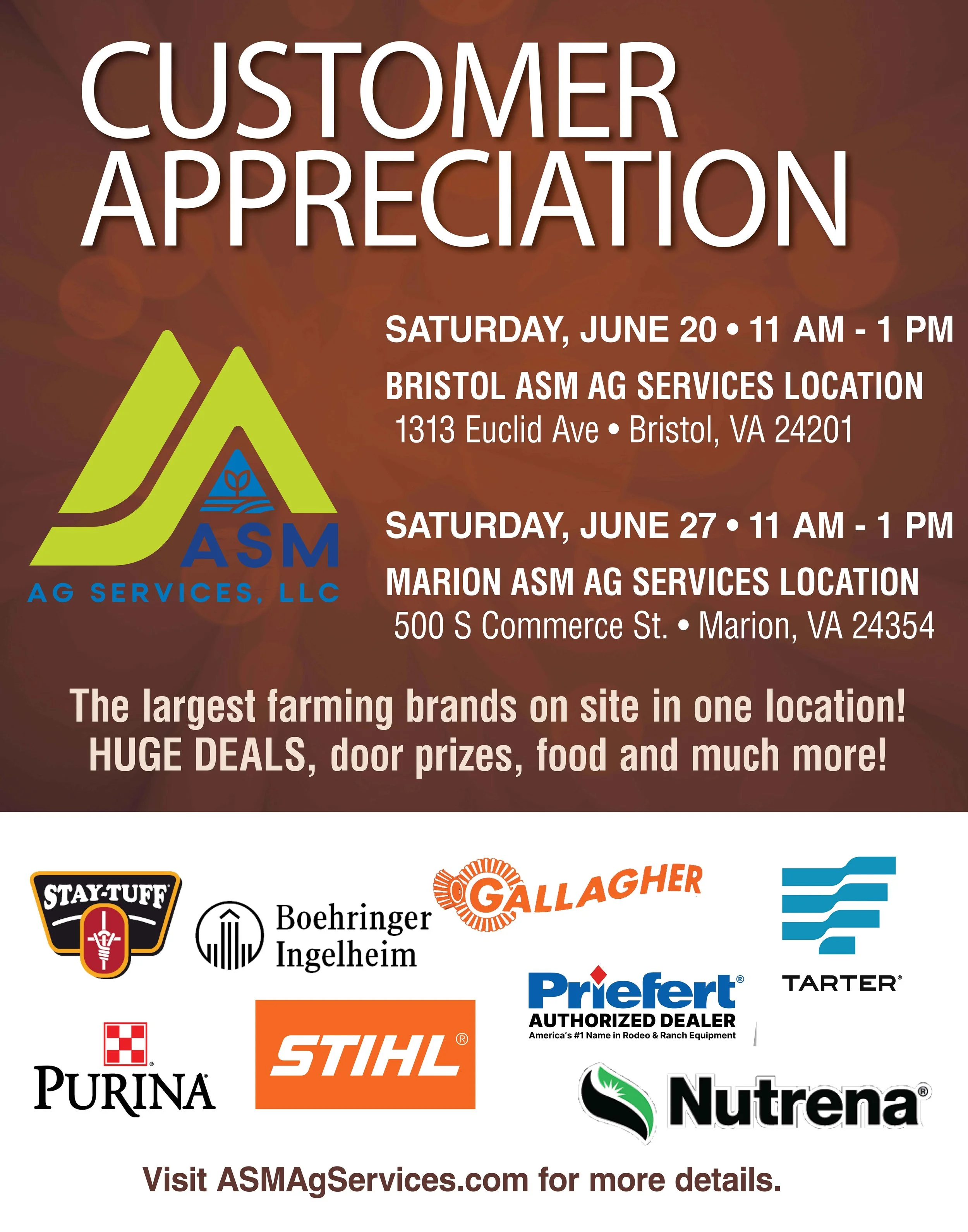 Events Bristol Customer Appreciation - Saturday, June 20 • 11AM-1PMMarion Customer Appreciation - Saturday, June 27 • 11AM-1PMEnjoy great deals, food, and more during ASM’s customer appreciation day events!